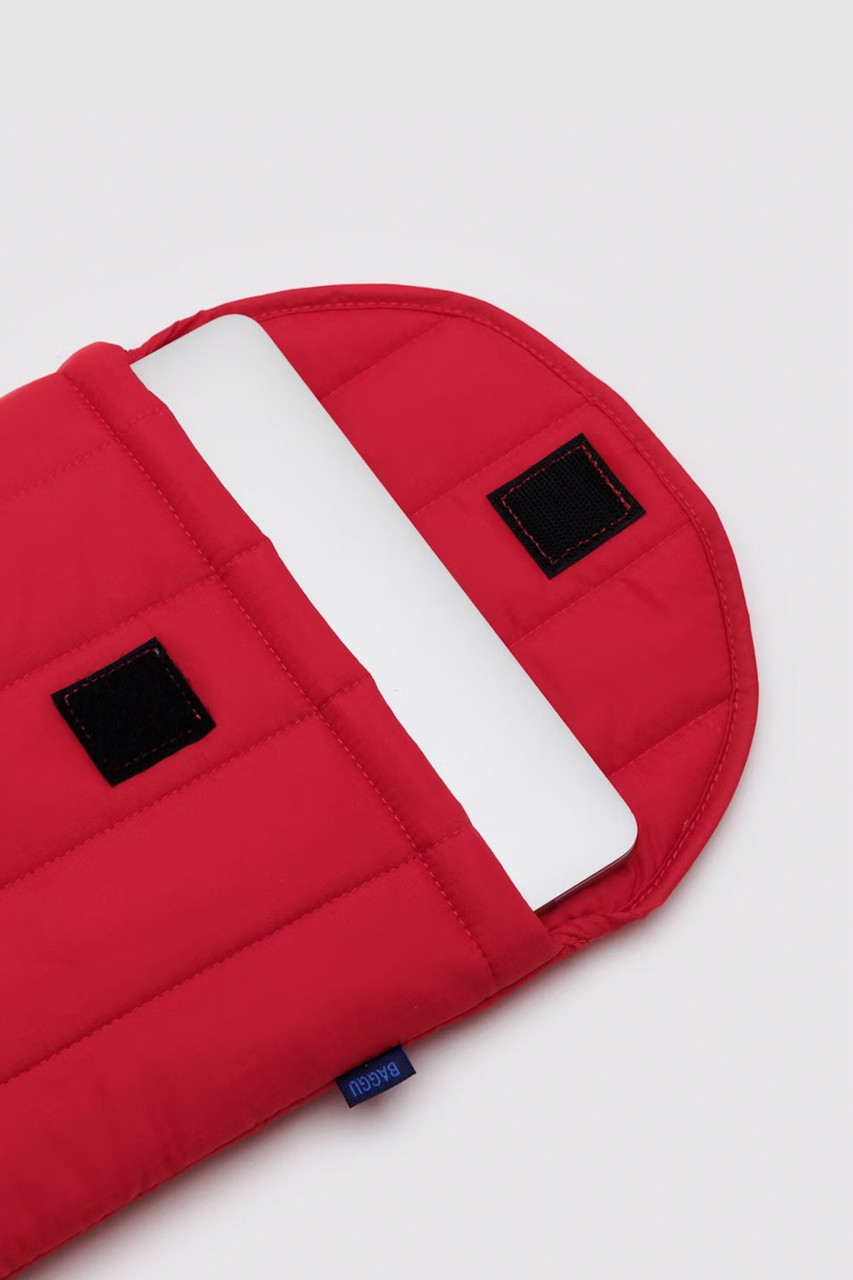 Your laptop does so much for you. Doesn’t it deserve a cozy place to live? Our puffy laptop sleeve is quilted and stuffed to provide most 14″ laptops and tablets with just enough padding for comfortable rides. By Baggu.