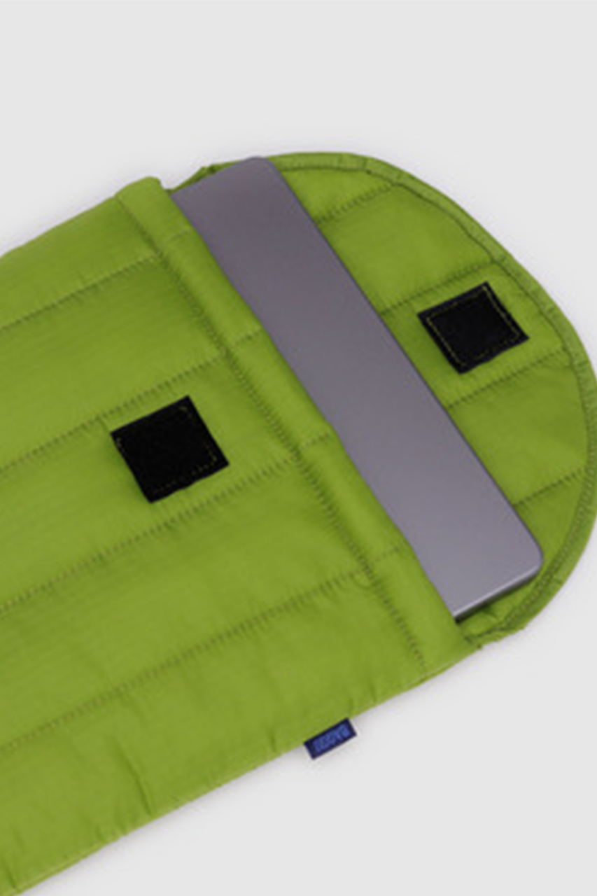 Your laptop does so much for you. Doesn’t it deserve a cozy place to live? Our puffy laptop sleeve is quilted and stuffed to provide most 14″ laptops and tablets with just enough padding for comfortable rides. By Baggu.