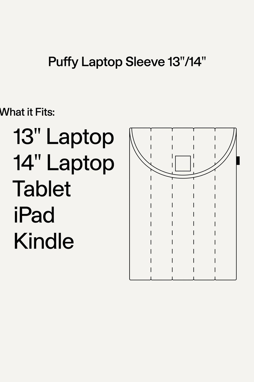 13″/14″ refers to the device screen size, measured diagonally Velcro closure Measures 13″ × 10 ¼” × ¾” Recycled ripstop nylon, recycled PET polyfill Machine washable
