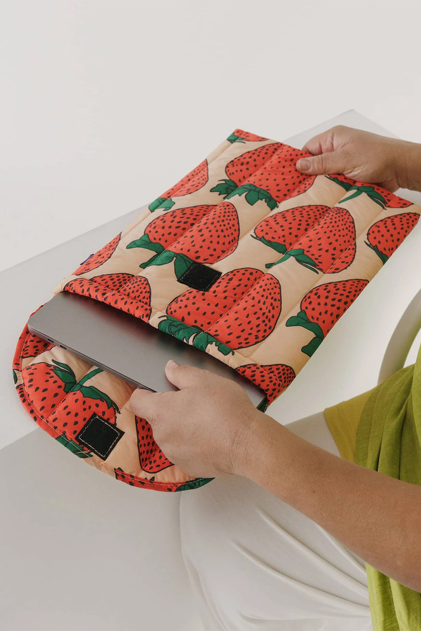 Your laptop does so much for you. Doesn’t it deserve a comfy cozy place to live? Our puffy laptop sleeve is quilted and stuffed to provide your 16″ laptop or tablet with just enough padding for comfortable rides. By Baggu.