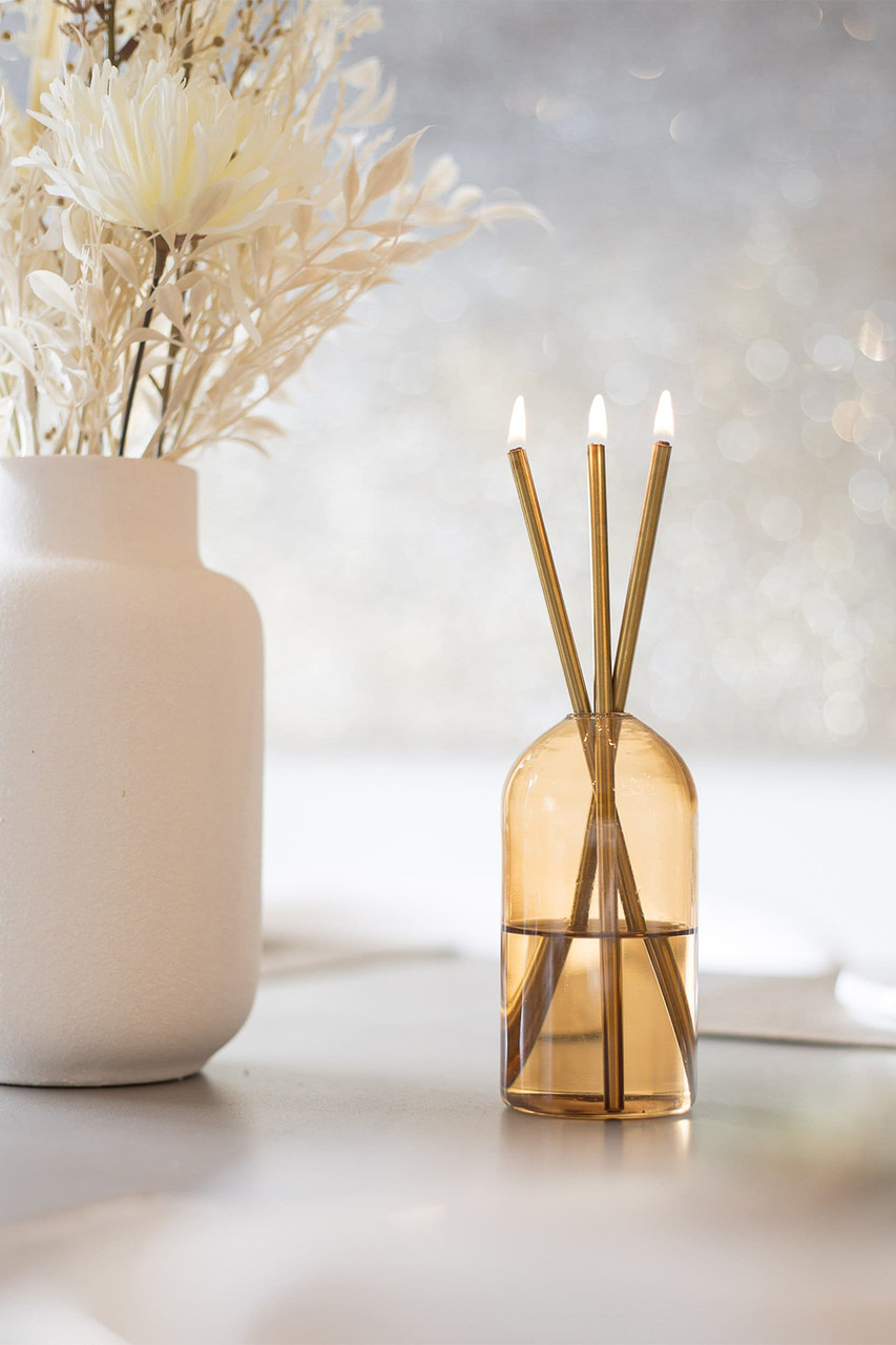 Golden Hour – The suns kiss goodnight. A golden-amber translucent vase that provides a subtle hint of warmth to any home décor. By Everlasting Candle Co.