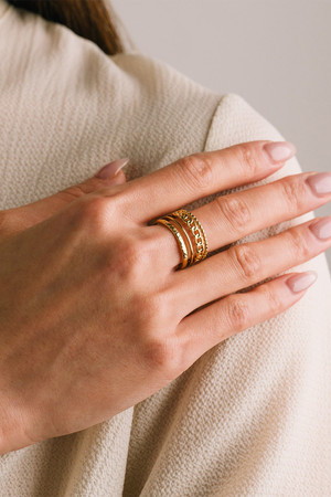 A ring with multi-faceted shape and texture that’ll captivate from all angles. Made with PVD and stainless steel, you can wear this waterproof ring anywhere. By Lover’s Tempo.