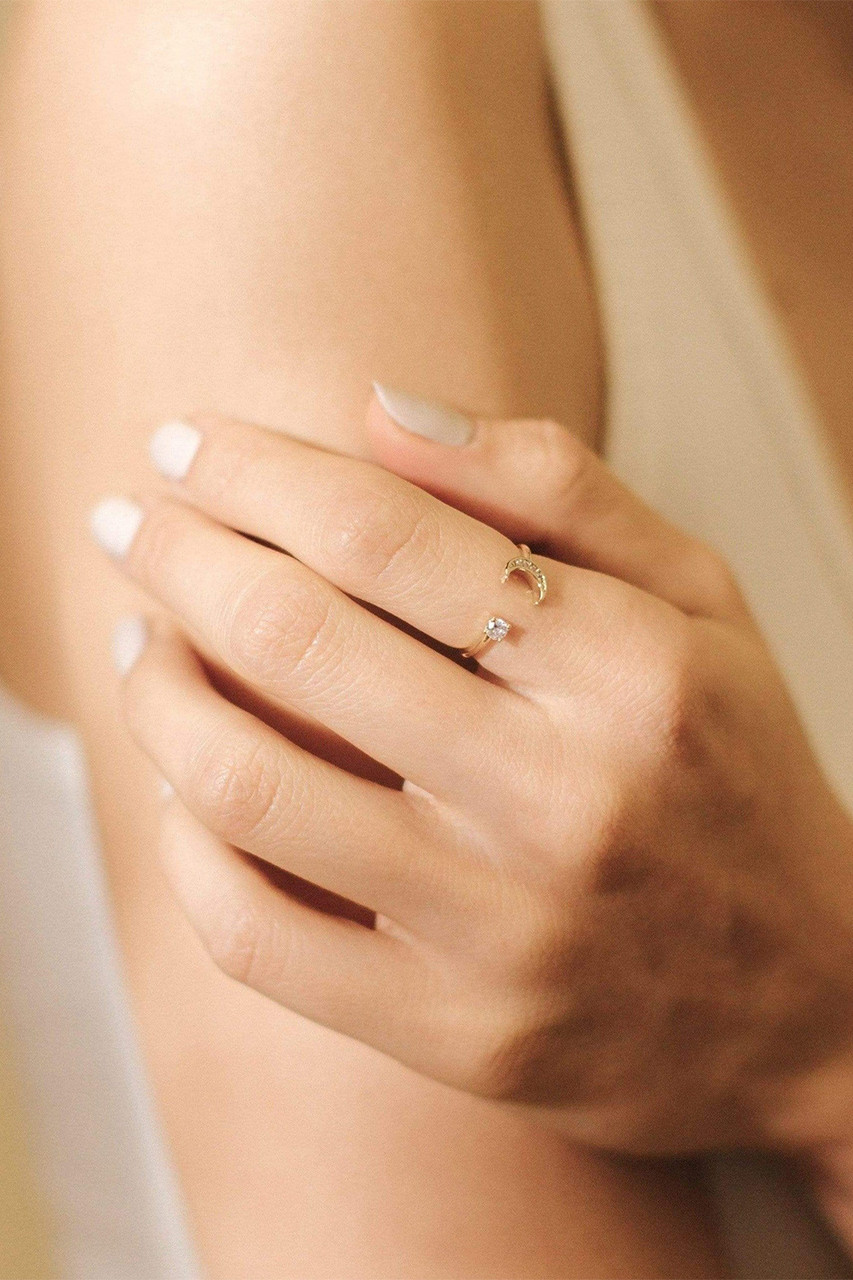 Our Moonlit Ring features a tiny crescent moon shaped charm glistening with cubic zirconia jewels and a tiny crystal at the other end of this open-band ring. By Lover’s Tempo.