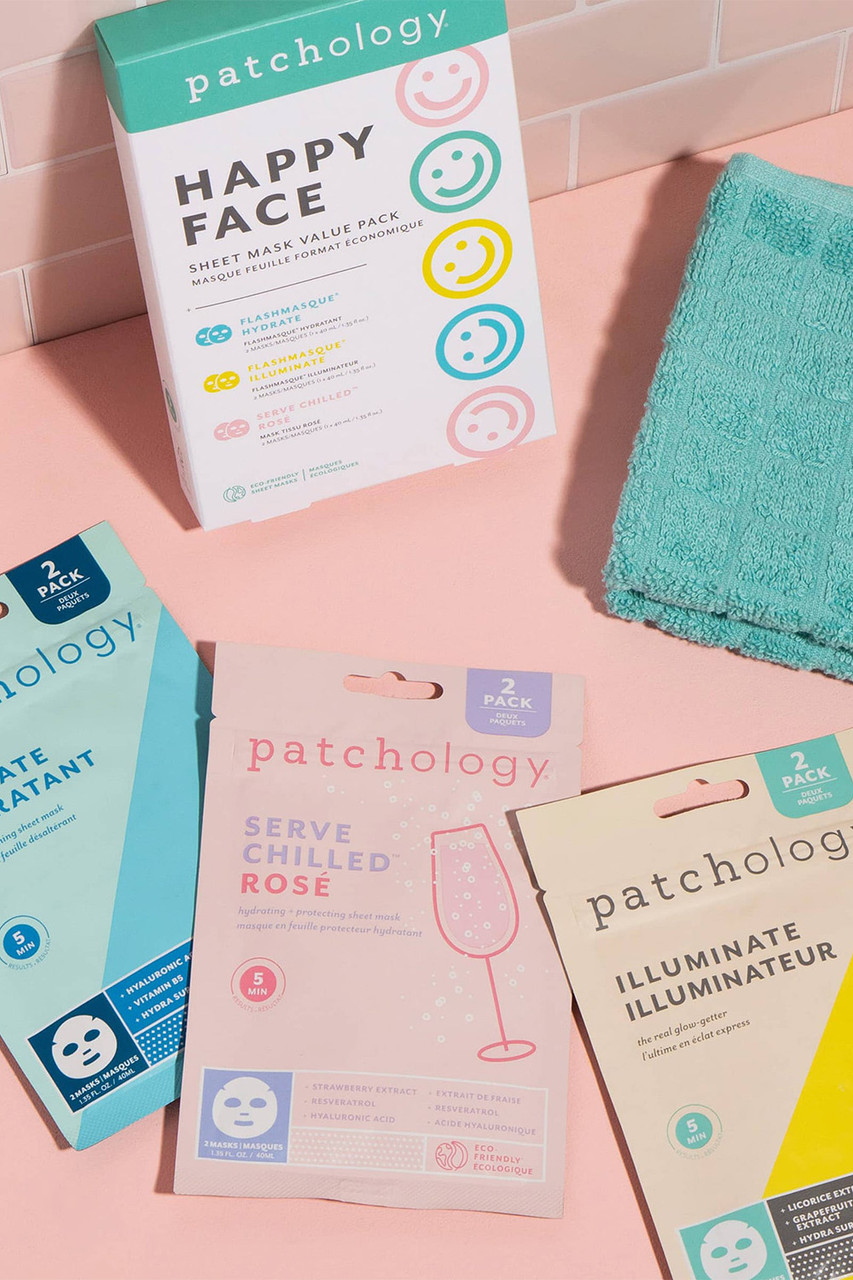 The ultimate 6-pack facial sheet mask bundle Happy Face with Illuminate, Hydrate, and Rosé. Each mask is specially designed to provide your skin with the care it needs to look and feel its best. By Patchology.