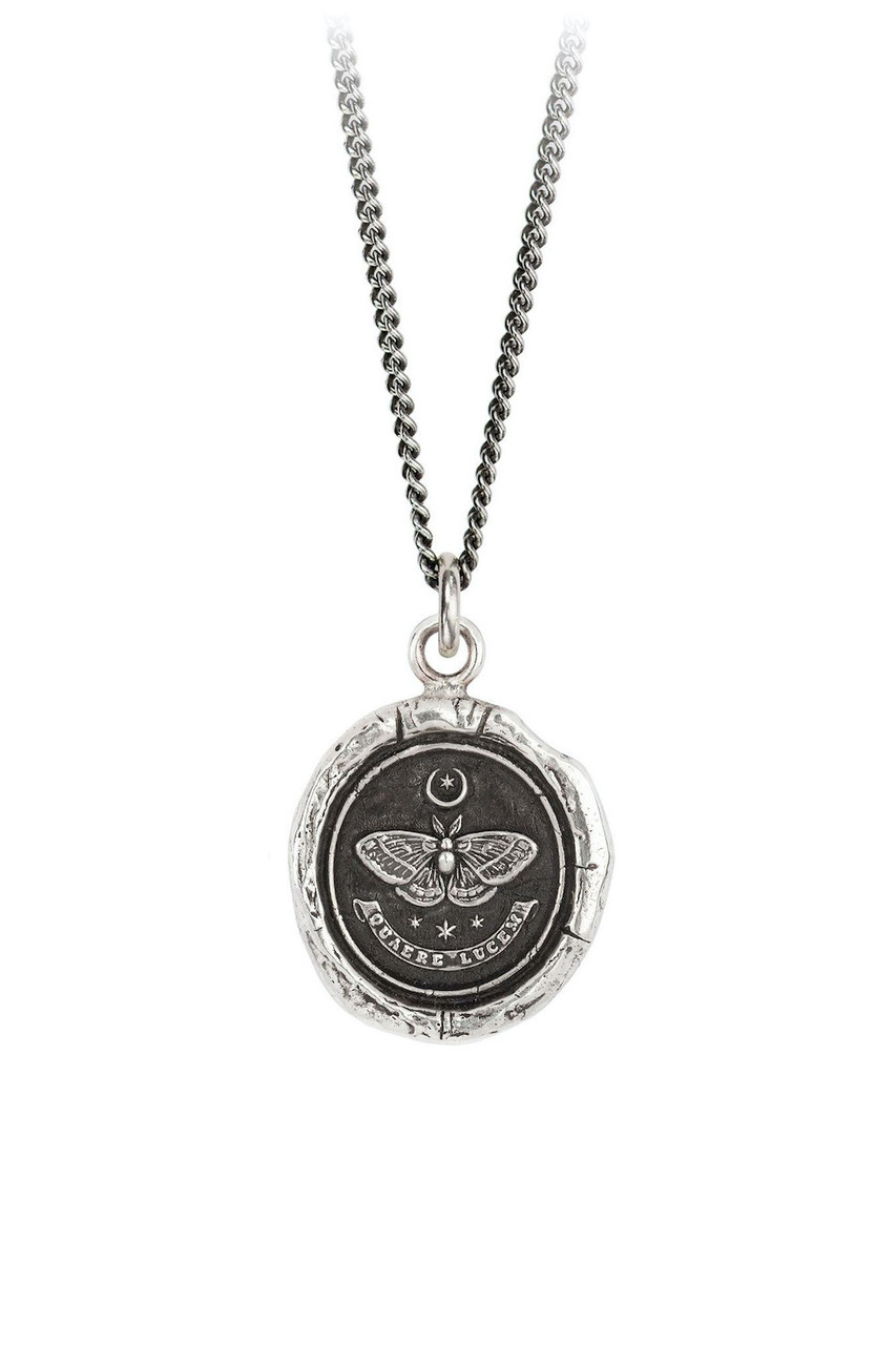 This talisman reads ‘Quaere Lucem’ in Latin, meaning ‘Seek the Light.’ The moth is a reminder that the guiding light you are seeking is inside you. Follow your intuition to your path of transformation and realize your highest potential. As a certified carbon-neutral B Corp, we’re committed to environmental responsibility—our jewelry is sustainably handcrafted with 100% recycled metals in our Vancouver studio using antique wax seals and imagery from the Victorian era. Handcrafted in Vancouver, Canada. By Pyrrha.
