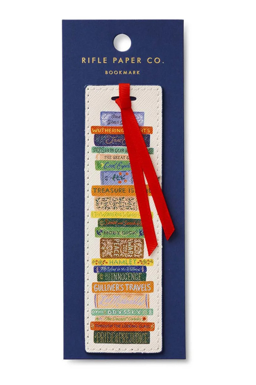 Never lose your spot with our illustrated Book Club bookmark, featuring a stack of classic titles and a grosgrain ribbon tie. By Rifle Paper Co.