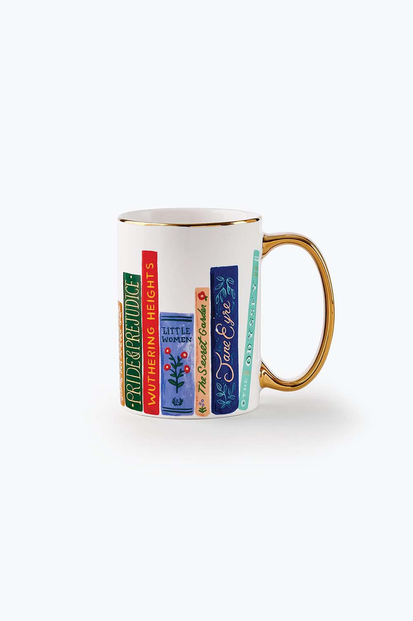 Settle in with a warm drink and a good book with our Book Club mug, featuring our favorite classic titles. Our porcelain mugs feature illustrated designs and a gilded rim and handle to add a little something special to your favorite beverage. By Rifle Paper Co.