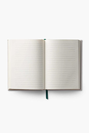 Lay-flat binding Book cloth cover with ivory uncoated paper Embroidery on front cover with metallic thread Natural white text paper interior Grosgrain ribbon bookmark Acid free paper 5.75″ W × 8″ L × 1″ H 240 lined pages