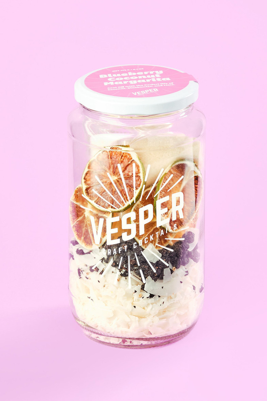 Cocktail Kit includes: ready for infusion 32oz glass jar with Coconuts, Blueberries, Limes and Organic Cane Sugar.