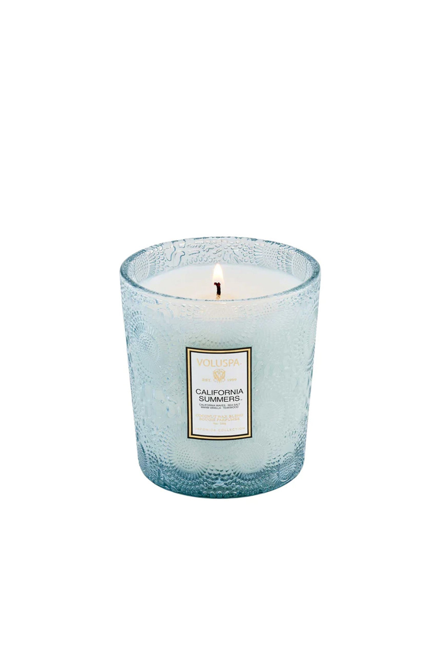 Fragrance Family: Fresh / Aquatic. Notes of California Waves, Sea Salt, Warm Vanilla, Teakwood. Plunge into the blue horizon and escape into another realm, where worries are reduced to coasting on hypnotic rolling waves. A salty ocean breeze tickles the skin as the sun reaches its peak height of the day, leaving you to bask in a teakwood sling chair, lathered in a tonic of warm vanilla and coconut milk. Welcome in the rising tides to wash away the cares of the day. Voluspa invites you to take the scenic route, so you may always return for California Summers. By Voluspa.