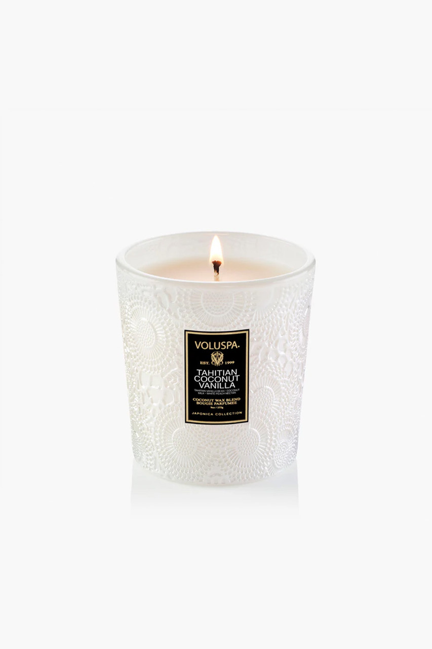 Invite a tropical canopy of fragrance, no SPF required. Lounge in the indulgent glow of juicy white peach, frothy fresh coconut milk, and Tahitian Vanilla Bean. Discover an unexpected paradise and bask in the warmth of Tahitian Coconut Vanilla. By Voluspa.