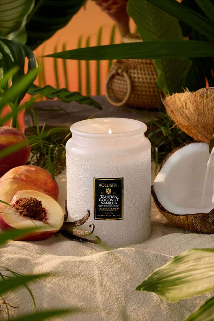 Voluspa’s unique coconut wax blend is housed in a 18 oz. embossed glass vessel and is topped with a metal lid, adorned with Japonica detailing that keeps the candle dust-free when not in use. The single wick allows you to enjoy fragrance throw for 100 hours. Our candles are handcrafted in the United States and feature our proprietary, clean-burning coconut wax blend and natural wicks. Our products are free of phthalates, parabens and sulfates and are never tested on animals. Up-cycle this best seller into a keepsake after the last burn.Notes of Tahitian Vanilla Bean, Coconut Milk, & White Peach Nectar