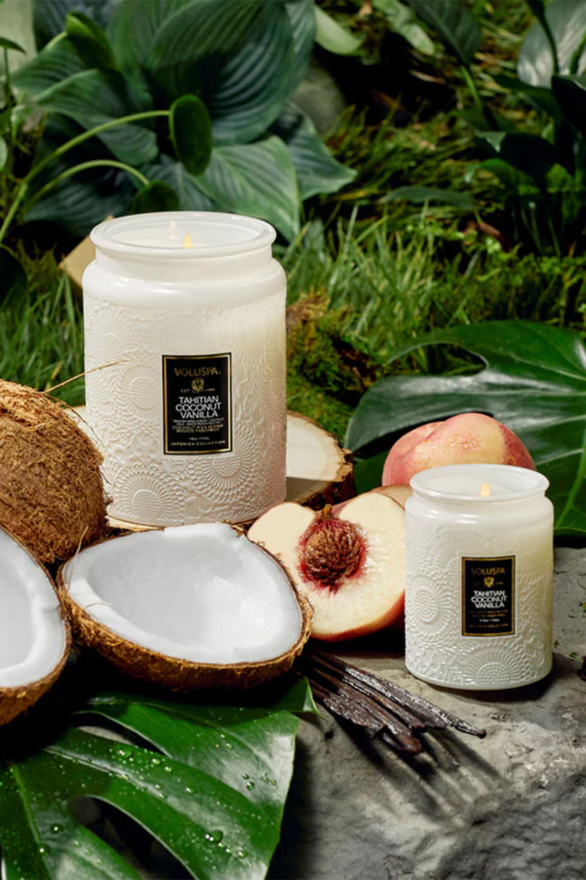 Travel straight to the tropics and escape to a private island. Tart Citrus and White Peach Nectar are swirled with Fresh Coconut Milk and Tahitian Vanilla Bean for ultimate bliss. Topped with exotic Jasmine and Orange Flower Blossoms and garnished with Pistachio Creme for an unexpected paradise. By Voluspa.