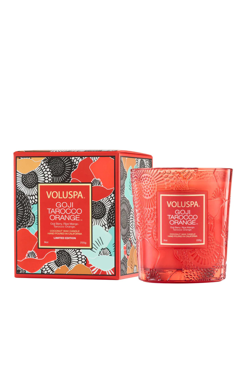 Fragrance Family: Citrus / Fruity. Notes of Goji Berry, Ripe Mango & Tarocco Orange. Boldly thrilling, this vivid scent shakes ripe mango and bittersweet goji berries wide awake, while resting on a bed of tangy blood orange. Arousing the senses with tart tangerine and piquant pomelo nectar, the freshly squeezed and exhilarating aromatic instantly lifts the spirits and adds vibrant shine to the day. By Voluspa.